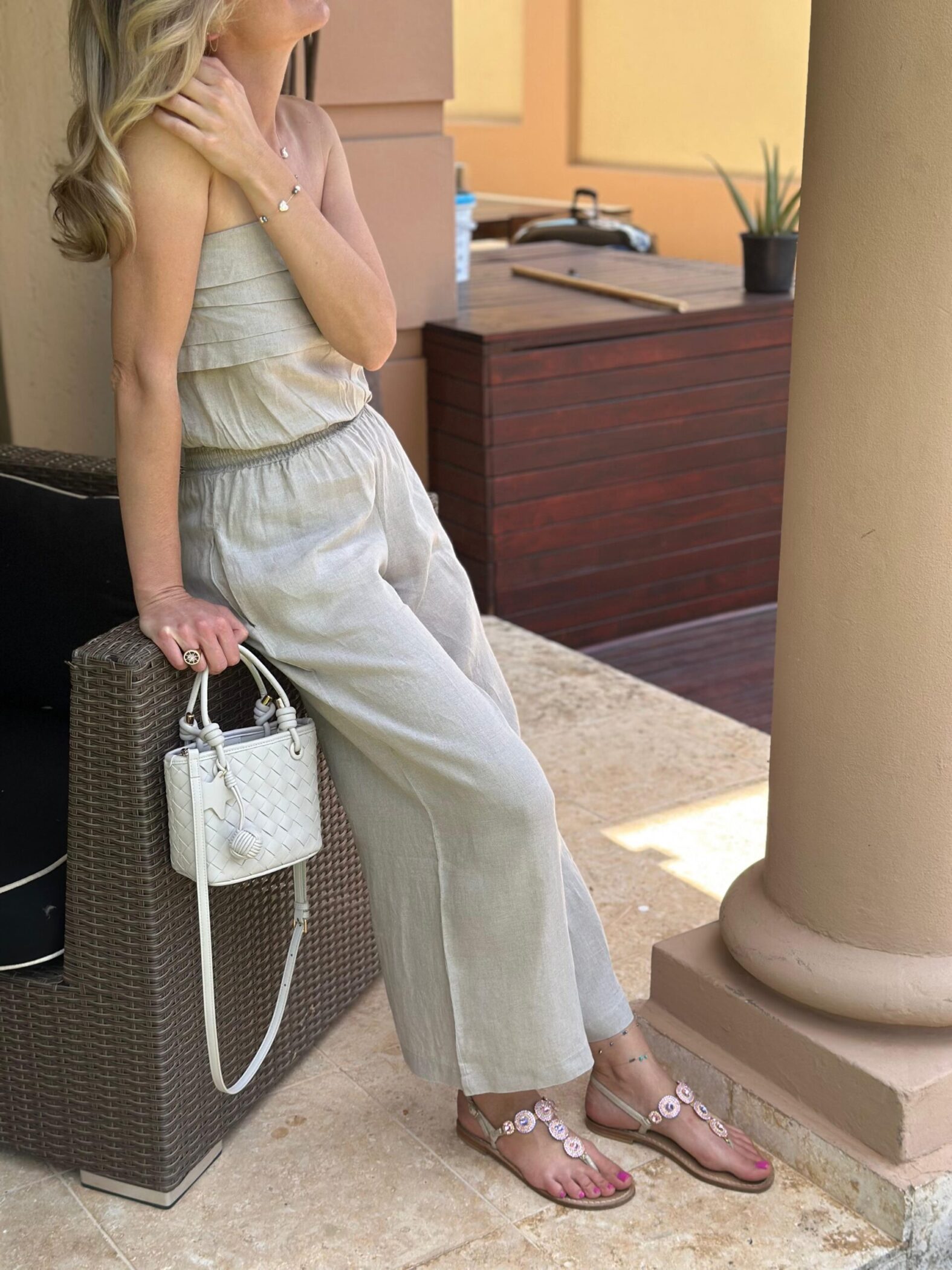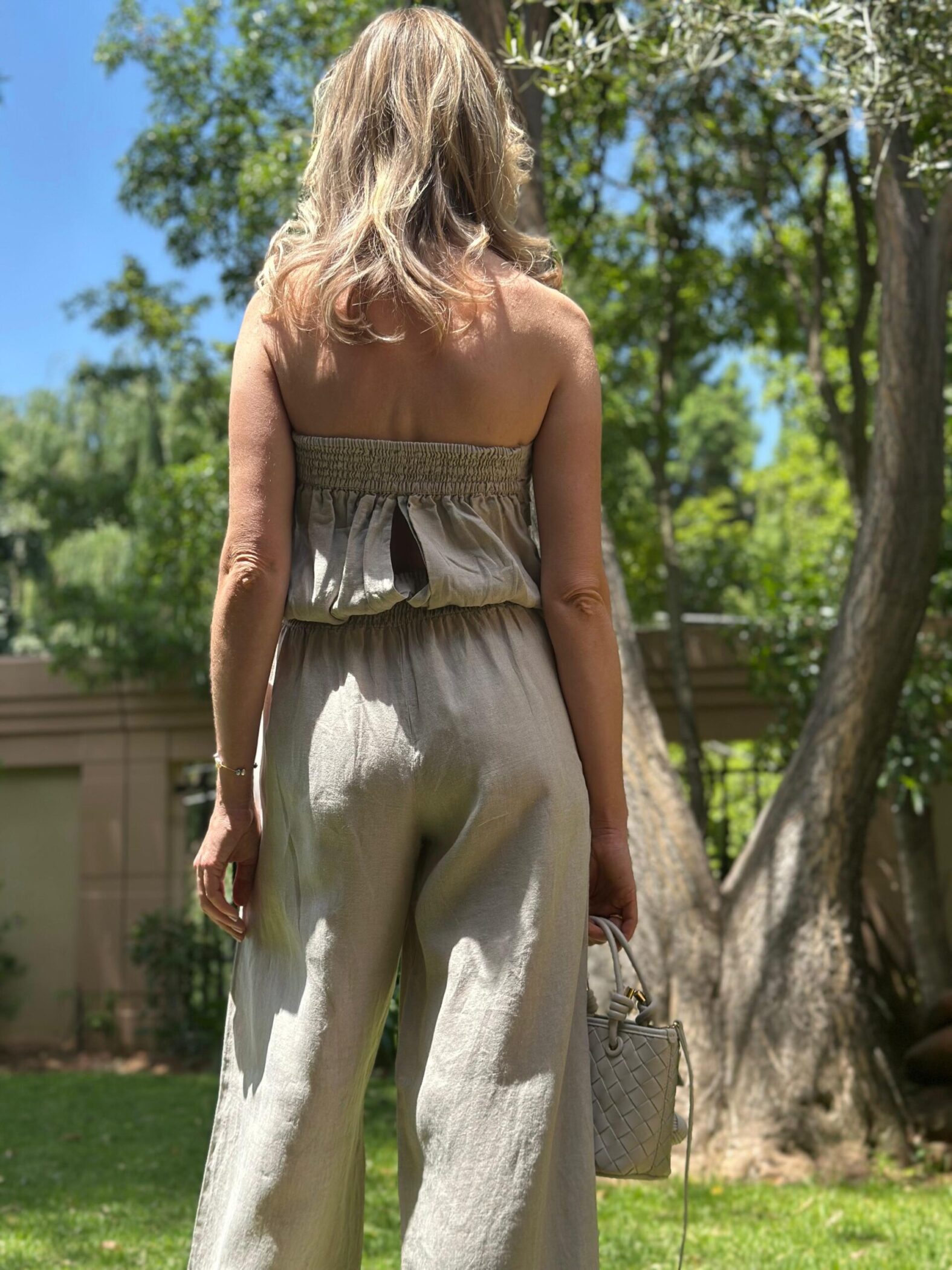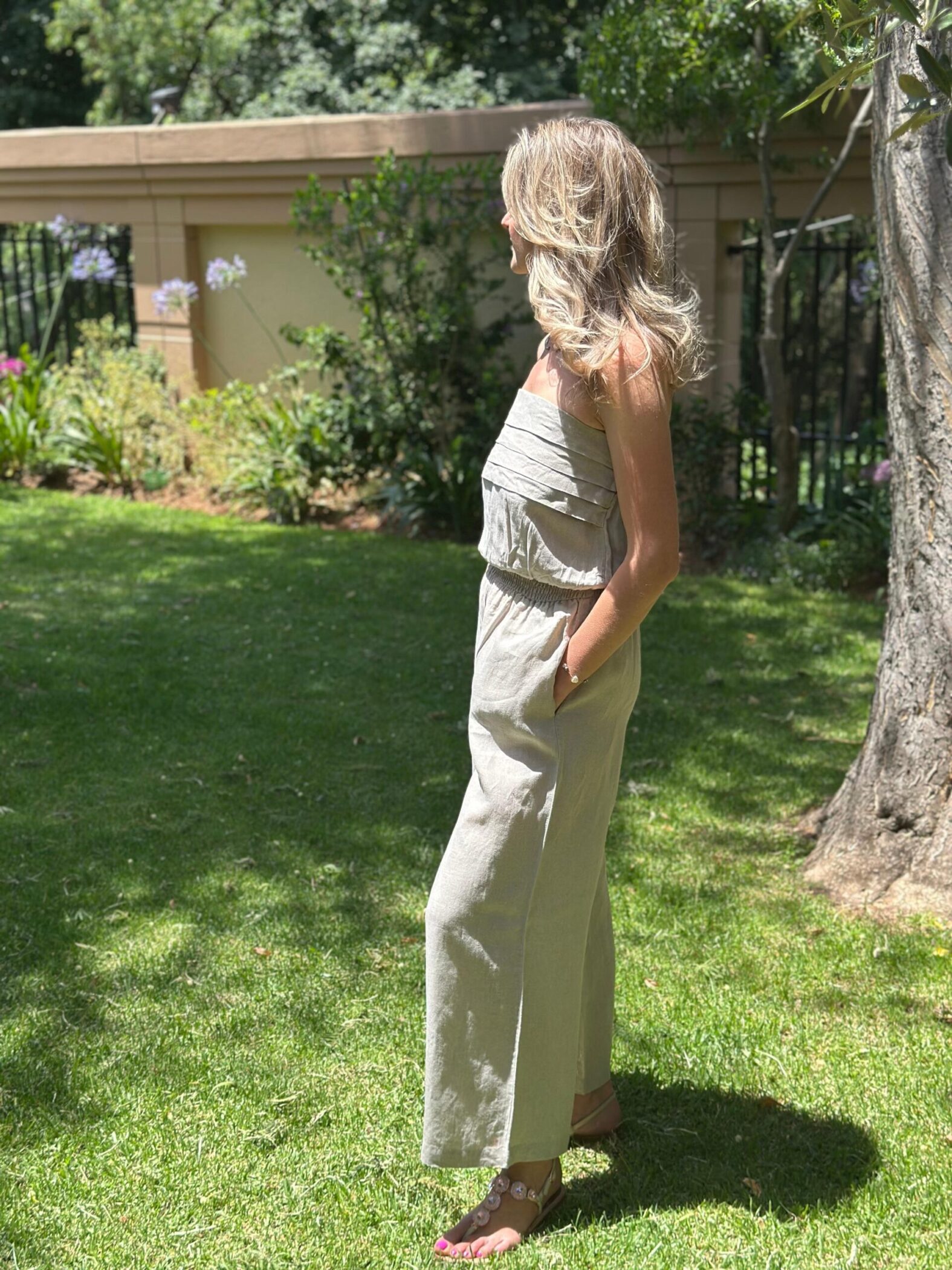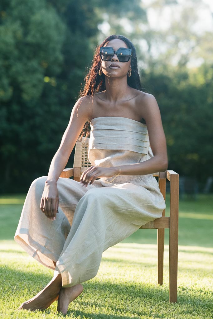 Embrace the carefree spirit of summer with this stunning Strapless Pure Italian Linen Jumpsuit that combines style and comfort effortlessly. Crafted from lightweight and breathable Italian linen fabric, this jumpsuit is a perfect choice for those warm and sunny days. The strapless design highlights your shoulders so beautifully. Pair it with our Swarovski sandals and a floppy hat for the ultimate summer ensemble.